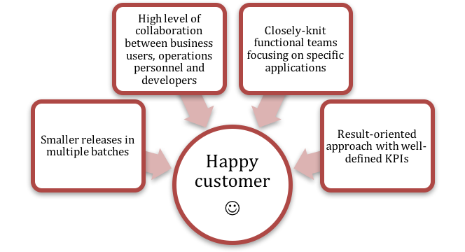 As we know, there are skill centric silos in traditional IT methodologies. A new feature has to go through at least 3 to 4 silos before a customer receives it. The feature has to spend 80% of the time waiting and shuttling between silos. DevOps teams, on the other hand, are arranged in cells that contain dedicated functional teams, and focus on one application. These cells are self-sufficient as they contain developers, testers, business analysts and operators. The work can be moved from one stage to another without any hand-offs, promoting cross-training and focusing the team on the end goal rather than their individual work. The reduction in cycle time that is achieved by this method improves productivity and lowers the operating costs for the customers.