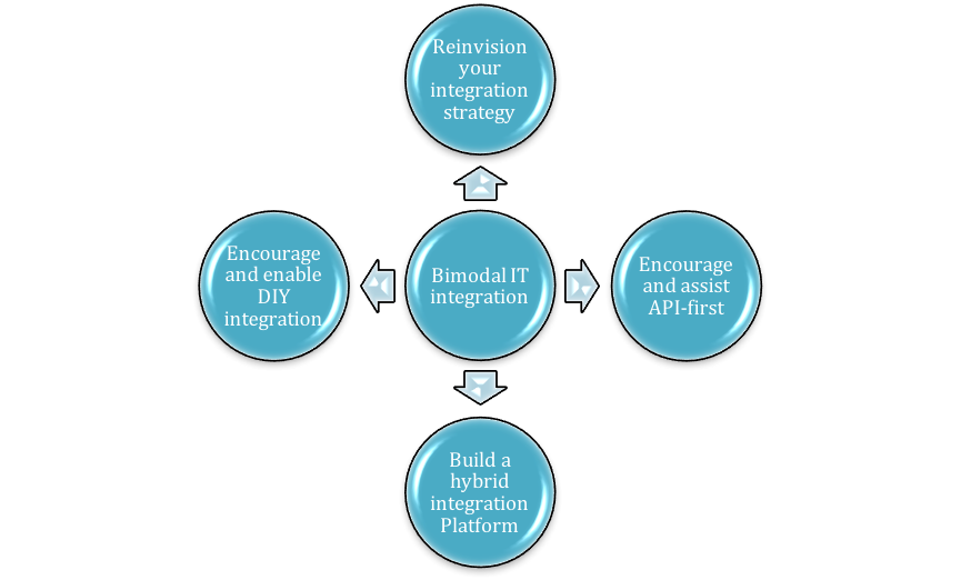 The systematic and traditional approach towards integration does not have the agility to support ubiquitous, fast-time-to-value and adaptive nature that modern integration needs. It is often driven by semi-autonomous initiatives of departments and lines of businesses. But CIOs are now being forced by new bimodal IT realities of digitalization, cloud, mobile and big data to change their view of integration and pursue it right from the stage of application design. It is needed now to allow traditional methods to evolve dramatically to tackle the new reality of pervasive integration.