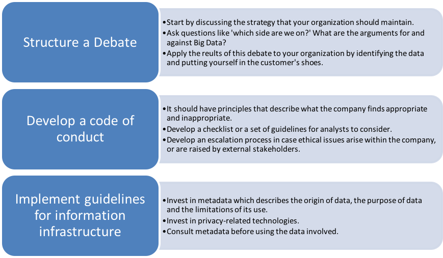 Companies should try to broker a balanced approach to the use of Big Data analytics to better serve the customers and avoid the potential for reputational damage that comes from crossing the fine line and for legal action. A proper code of conduct should be made based on the debates about ethics with marketing and legal staff.