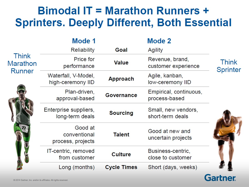 Bimodal IT is a term coined recently by various IT analysts and media that describes a new paradigm for CIOs and for IT as a whole. Peter Sondergaard, senior vice president at Gartner and global head of research, said last November that while CIOs might not be able to transform their existing IT department into a digital startup, they could turn it into a bi-modal IT organization.